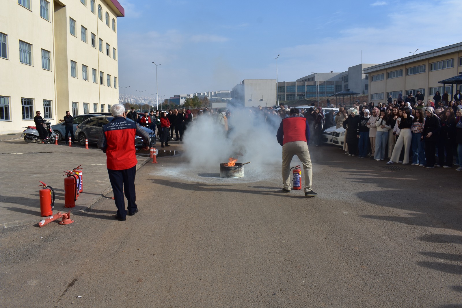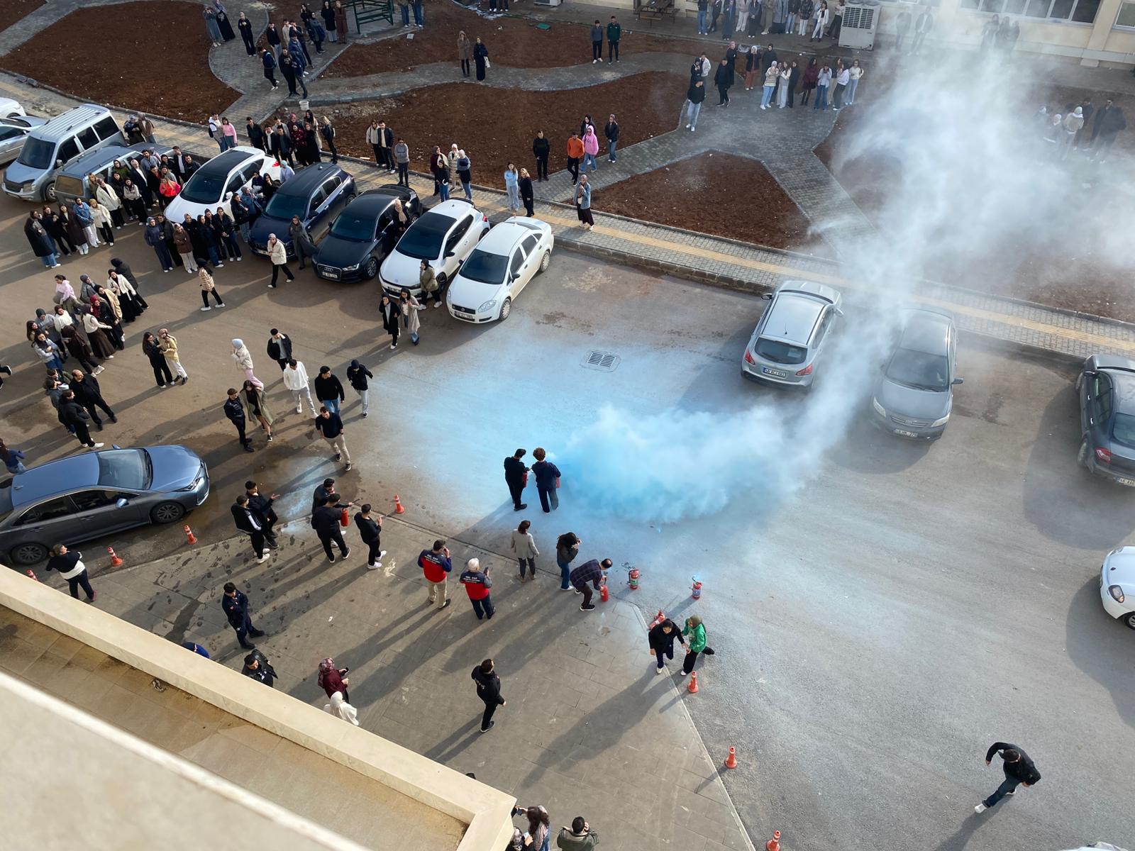 Yangın senaryosu doğrultusunda bina dışında yangın tatbikatı ve bilgilendirme yapılarak, yangına ilk müdahale, söndürme ekipmanı kullanımı ve acil durum davranışları katılımcılara uygulamalı olarak aktarıldı.