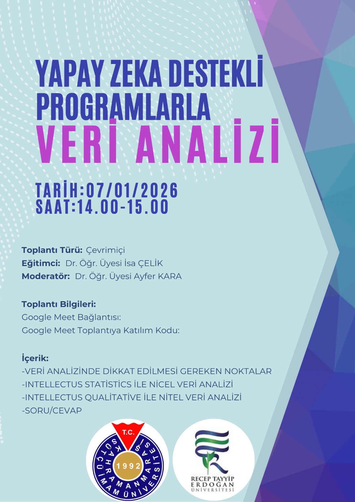Eğitim Dr. Öğr. Üyesi İsa Çelik tarafından verilmiş, moderatörlüğü Dr. Öğr. Üyesi Ayfer Kara tarafından yürütülmüştür. Etkinlik, Hemşirelik Bölümü öğretim elemanlarının nicel veri analizi konusundaki bilgi ve becerilerinin geliştirilmesine katkı sağlamıştır.