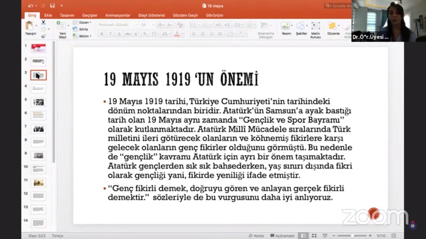 Kahramanmaraş Sütçü İmam Üniversitesince 19 Mayıs Atatürk’ü Anma, Gençlik ve Spor Bayramı münasebetiyle “Atatürk’ün Gençlik ve Spora Bakışı ve 19 Mayıs Gençlik ve Spor Bayramının Önemi” başlıklı çevrim içi konferans düzenlendi.