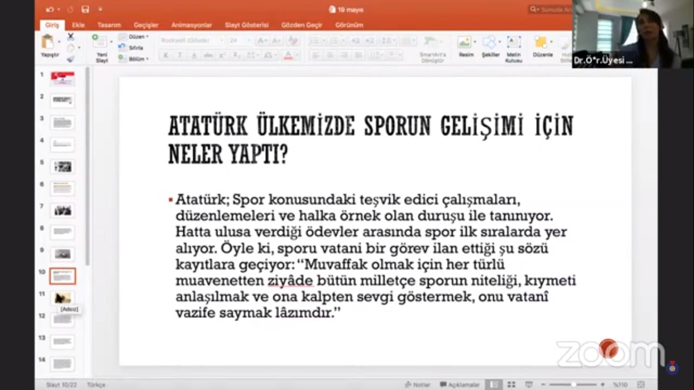 19 Mayıs 1919 tarihinin Türk milletinin kaderi için dönüm noktalarından biri olduğuna değinen Dr. Öğr. Üyesi Müjde Atıcı; Cumhuriyetimizin kurucusu Gazi Mustafa Kemal Atatürk’ün böylesine anlamlı bir günü Türk gençliğine armağan ettiğini belirterek, Atatürk’ün spora ve gençlere verdiği öneme ilişkin bilgiler aktardı. Dr. Öğr. Üyesi Atıcı, Atatürk’ün gençlik ve sporla ilgili şu sözlerini paylaştı: