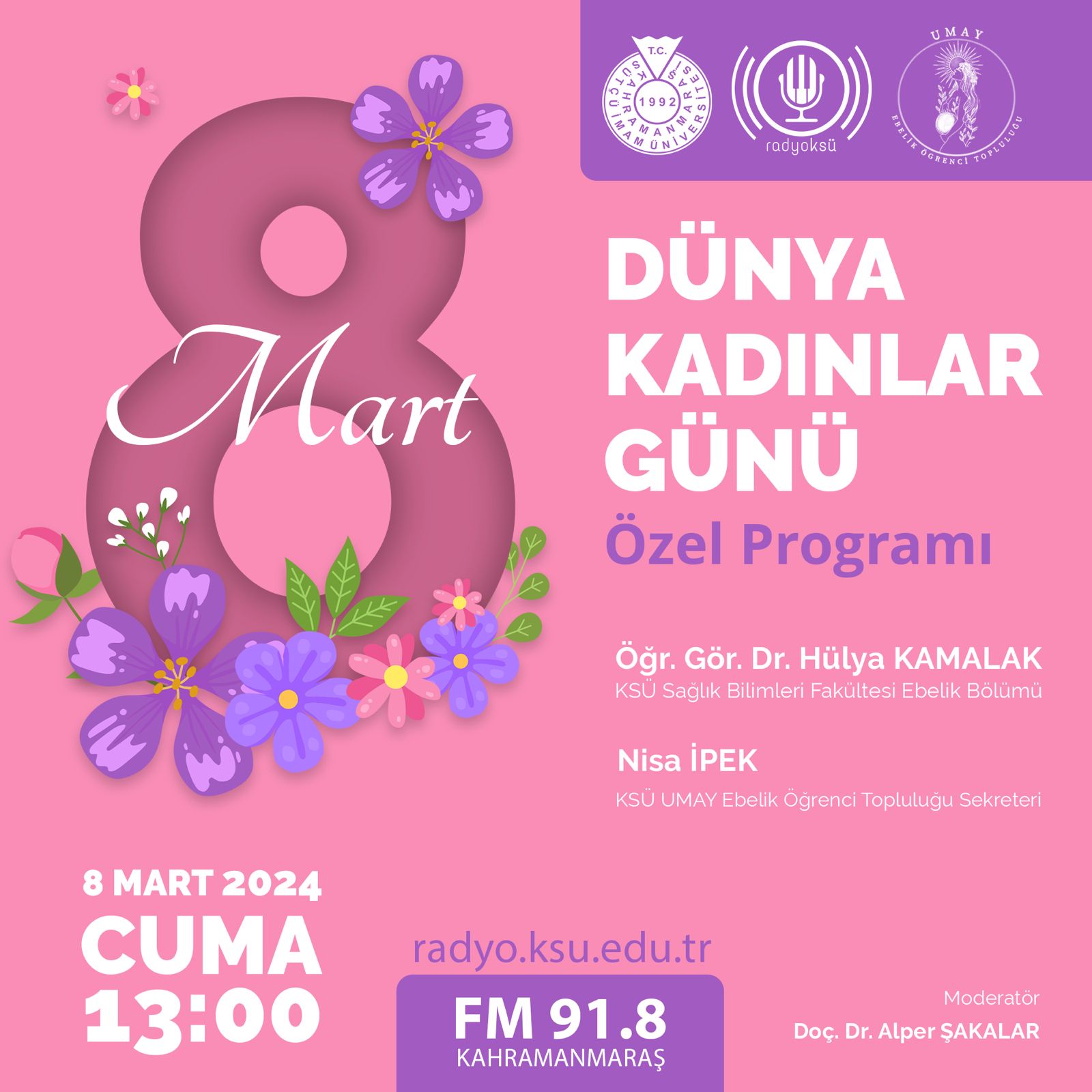 ''KSÜ Umay Ebelik Öğrenci Topluluğu'' danışmanı Öğr. Gör. Dr. Hülya KAMALAK ve topluluk sekreteri Nisa İPEK 8 Mart Dünya Kadınlar Günü'ne özel Radyo KSÜ'de Doç. Dr. Alper Şakalar'ın ev sahipliğinde söyleşi gerçekleştirmişlerdir.