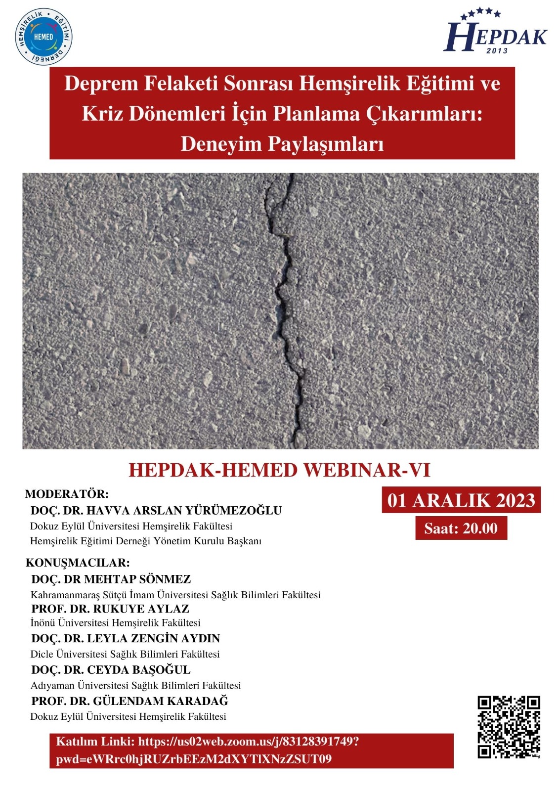 HEPDAK-HEMED Webinar-VI olan “Deprem Felaketi Sonrası Hemşirelik Eğitimi ve Kriz Dönemleri için Planlama Çıkarımları: Deneyim Paylaşımları” 02.12.2024
