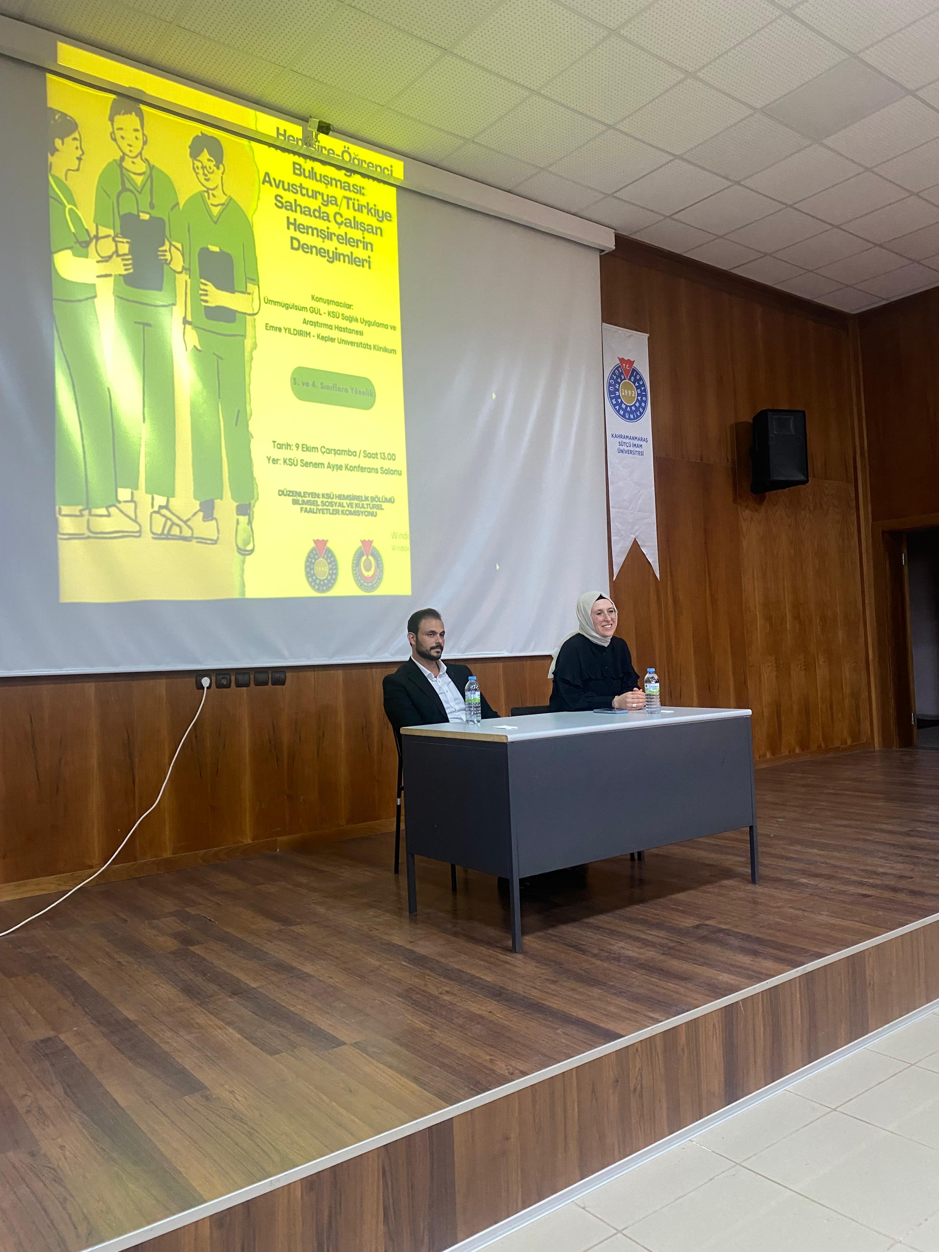 Konuşmacılarımız Hemşire Emre Yıldırım (Avusturya) ve Hemşire Ümmügülsüm Gül (Türkiye) mesleğimize ve kendi eğitim süreçlerine ilişkin deneyimleri hakkında sunum yaptılar. Ardından soru/cevap oturumu ile öğrencilerimizin merak ettikleri soruları yanıtladılar.