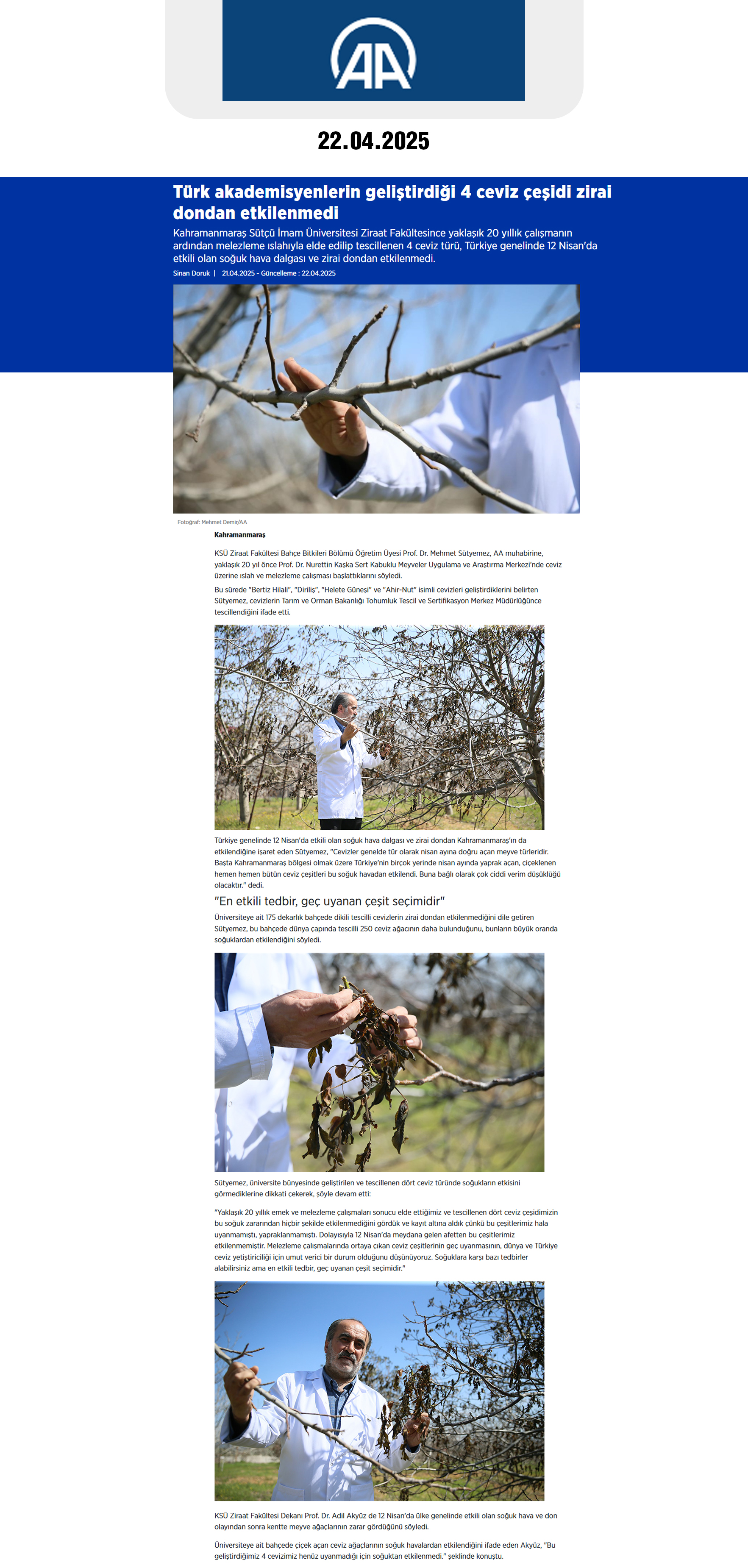 Haber Linki: https://www.aa.com.tr/tr/gundem/turk-akademisyenlerin-gelistirdigi-4-ceviz-cesidi-zirai-dondan-etkilenmedi/3544108