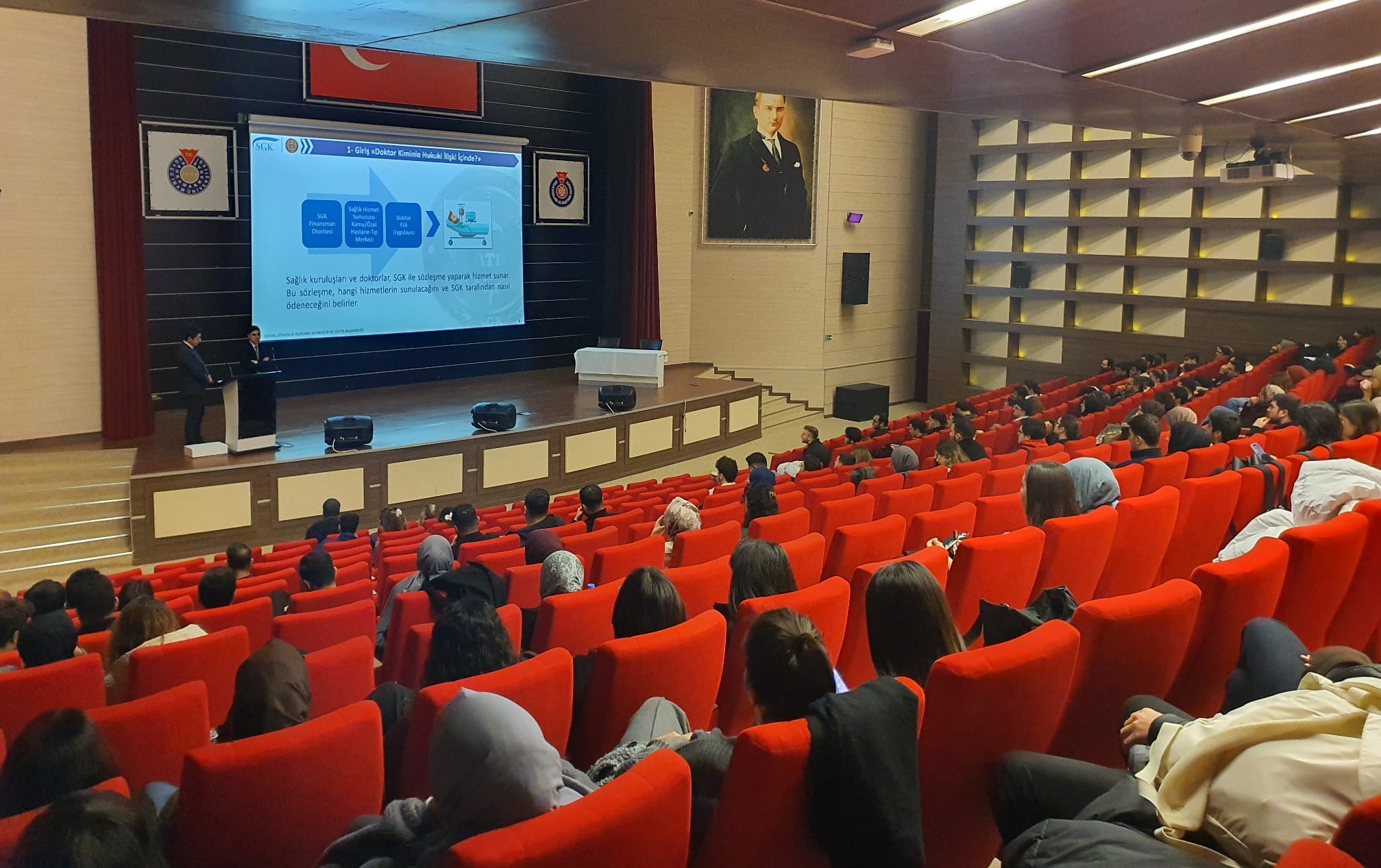 Fakültemizde öğrenim görmekte olan intörn öğrencilerimizin, mezuniyet sonrasında görev yapacakları sağlık hizmeti süreçlerinde karşılaşabilecekleri sözleşme ve protokol hükümleri, olası usulsüzlük durumları ve ilgili yaptırımlar konusunda doğru ve güncel bilgiye sahip olmaları için intörn öğrencilerimize yönelik SGK Rehberlik ve Teftiş Başkanlığı Uzmanlarınca 25 Aralık 2025 Perşembe günü saat:10.00'da Sağlık Uygulama ve Araştırma Hastanesi Konferans Salonunda SGK uygulamaları, sözleşme ve protokol hükümleri, sık karşılaşılan hatalar ve çözüm yollarını içerecek yüz yüze bilgilendirme eğitimi yapıldı.