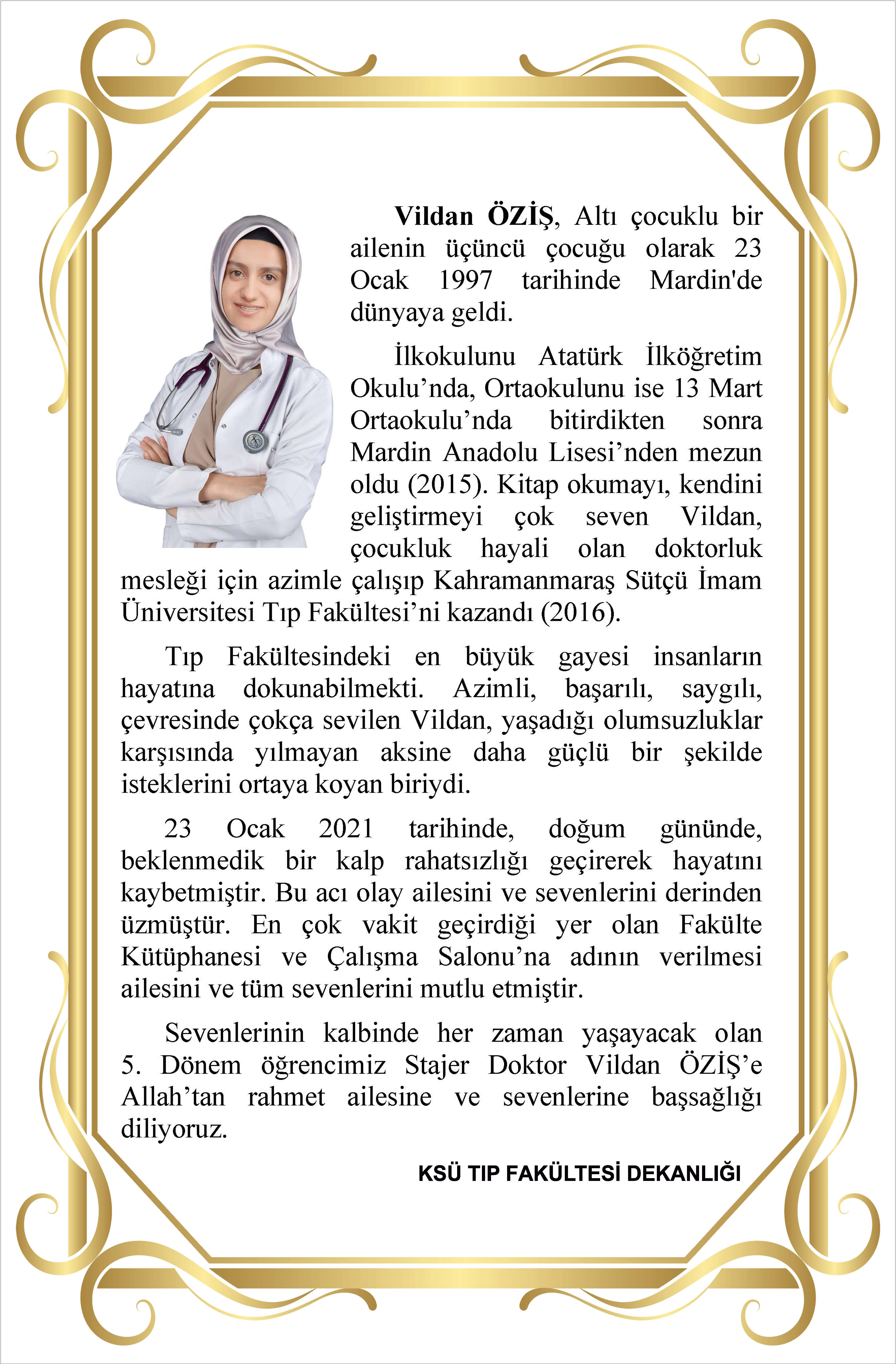 23 Ocak 2021 tarihinde, doğum gününde, beklenmedik bir kalp rahatsızlığı geçirerek hayatını kaybeden 5. Dönem öğrencimiz Stajer Doktor Vildan ÖZİŞ’in adı Fakülte Kütüphanesi ve Çalışma Salonu’na verildi.