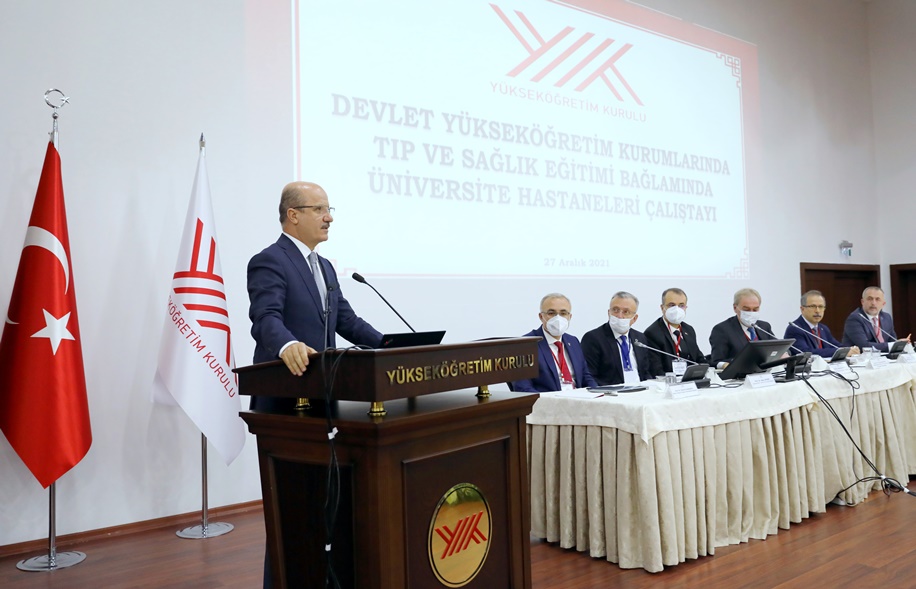 Yükseköğretim Kurulu Başkanlığı, Eğitim-Öğretim Dairesi Başkanlığı tarafından 27 Aralık 2021 Pazartesi günü saat 10.00'da “Devlet Yükseköğretim Kurumlarında Tıp ve Sağlık Eğitimi Bağlamında Üniversite Hastaneleri Çalıştayı" düzenlenmiştir. Başkanlık Konferans Salonu'nda yapılan ve Başkan Erol Özvar’ın başkanlığında düzenlenen çalıştaya, YÖK Üyeleri, bünyesinde tıp fakültesi bulunan devlet üniversitelerinin rektörleri, dekanlar ve ilgili akademisyenler katıldı. Üniversitemizi temsilen Rektör Yardımcısı Prof. Dr. Kadir SALTALI ve Fakültemiz Dekanı Prof. Dr. Mehmet BEKERECİOĞLU çalıştaya katılım sağlamışlardır.